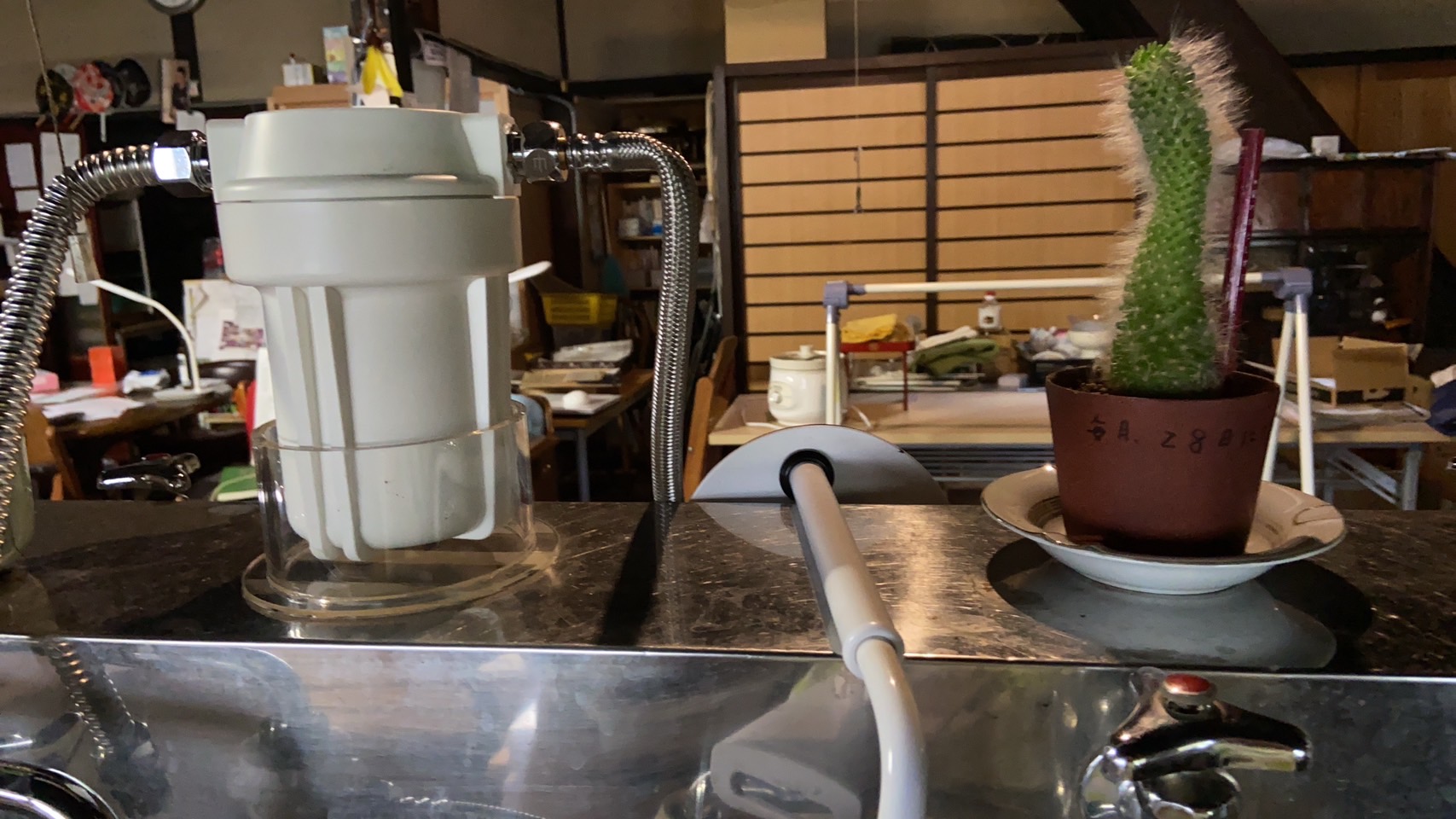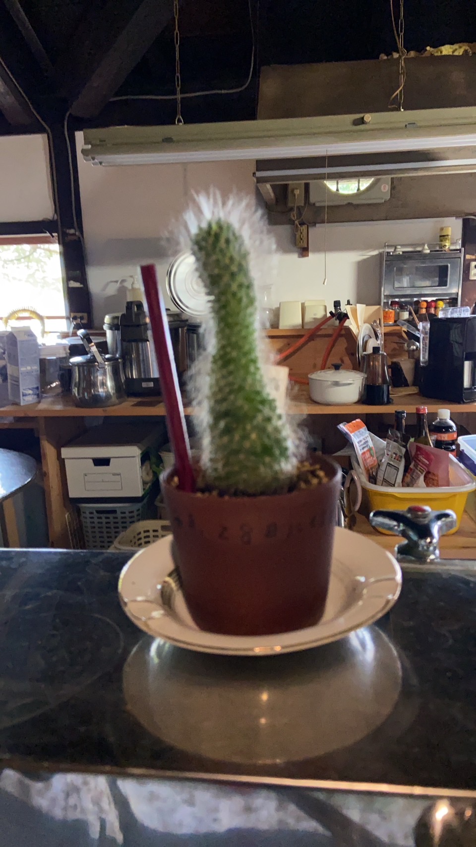 日光の方に置いたら、傾きが直るのでは?との意見で、しばらくやってみましたが、あまり効果なく、窓際をやめて、シンクの上に。